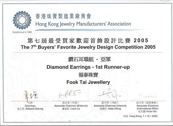 2005年於香港珠寶製造業廠商會舉辦的第七屆最受買家歡迎首飾設計比賽中奪得「鑽石耳環組 — 亞軍」。